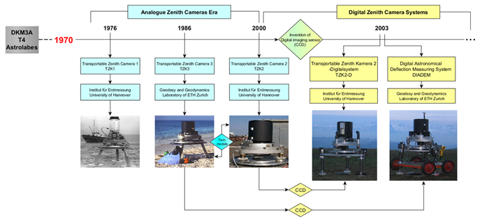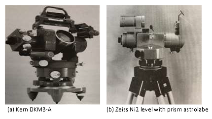 Classical geodetic astronomy (astrogeodesy) is concerned with the determination of astronomical observables, such as astronomical latitude and longitude, and azimuth from ground-based optical direction measurements to fixed stars, processes which also require precise time determination (Müller 1969; Schödlbauer 2000; Torge and Müller 2012). Several types of observational instruments have been used for this purpose. Until the 1970s, geodetic astronomical observations were done with optical observation instruments, such as Astrolabes, T4, and DKM3A theodolites (Figure 1). The use of these instruments required not only well-trained and skilled observers but also long observation durations (Hirt and Bürki 2006; Hirt et al. 2010a).