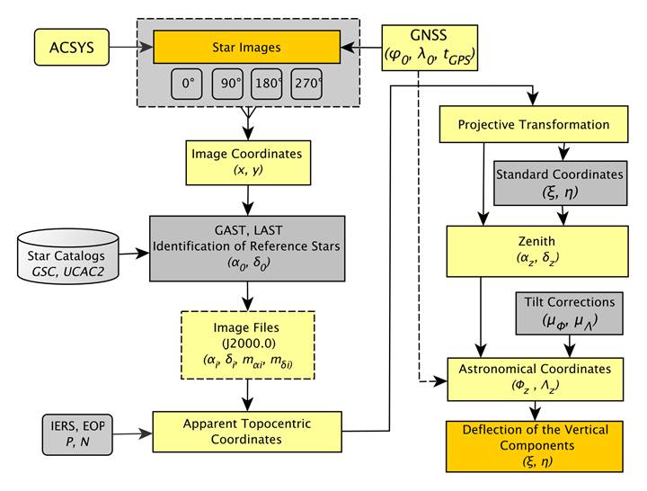 After the astrometric reduction process (Smart 1977), detected image stars and identified catalogue stars are compared through the standard deviations (SDs) of the matched stars. In practice, the SD is selected to be less than 0.3 arcseconds, and the stars that exceed this threshold value are not taken into account for the determination of zenithal coordinates. This process is calculated using software based on the USNO NOVAS C libraries developed by the USNO (Kaplan et al. 2011). To calculate apparent topocentric coordinates, algorithms given by Kaplan et al. (1989) and the Greenwich Apparent Sidereal Time (GAST) is calculated using the algorithms given by Kaplan (2005). Apparent Topocentric Coordinates are then used to calculate equatorial coordinates of the zenithal point through astrometric reduction procedure using an iterative approach. Astronomical coordinates, calculated as a result of the star images, and the geodetic coordinates are used to obtain the VD components. The simplified steps of ACSYS are shown in Figure 10. The calculation of the VD components is explained by Halıcıoğlu et al. (2012 and 2016) and the lengthy process will not be replicated in this paper.