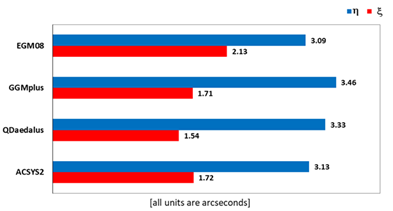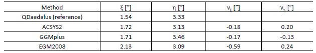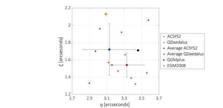 The QDaedalus astrogeodetic VDs accuracy is ~0.20” for both the North-South and East-West components. Because of the high accuracy of the QDaedalus VDs, they were preferred as the reference VD values for comparison with the other astrogeodetic VDs data at the ITU test station (Table 4, Figure 13).