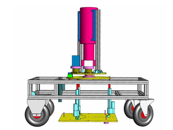 The utilisation of a tribrach as the supporting substructure not only prolonged the levelling process but had many other disadvantages. The total weight of the instrument (approximately 30kg) and design of the system produce a tilting effect that needed to be adjusted through a system-specific levelling procedure: iterative levelling (Halıcıoğlu et al. 2017a, 2017b). Also, the total weight of the system made transport logistically difficult and required a wheeled substructure design. Therefore, work began in 2016 to automate the observation and data processing procedure, with the support of the Scientific and Technological Research Council of Turkey (TUBITAK). In the scope of this project, a supporting substructure was designed based on the lessons learned from previous measurement campaigns that would facilitate the utilisation of the ACSYS during observations (Figure 5). The trolley of the new design was influenced by the success of the CODIAC design (Guillaume 2015), one of the most recently designed DZCS.