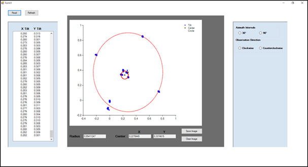 The radius of the best fitting circle is used to realign the system towards the zenith, the iterative levelling process defined in Halıcıoğlu et al. (2016). The radius correction is done by the linear actuator motors attached to the substructure. The levelling software and the graphics display of tilt values can also be examined during the levelling procedure (Figure 8). Therefore, it is possible to analyse any potential gross error during the observation. Furthermore, the software controls the observation procedure and analyses if there is a need to repeat the levelling procedure. After the system is levelled and a successful instrumental alignment towards the zenith, the observation process begins.