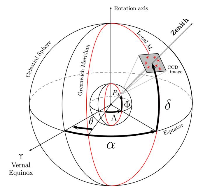 The stars in the acquired images are identified with the help of precision star catalogues such as the USNO CCD astrograph Catalogue 4 (UCAC4). The first step in data evaluation follows the astrometric reduction process, and therefore the stars in the captured images are identified. The possible stars in the images are identified using star centroiding algorithms, such as the point-spread function (PSF) method (Lauer 1999; Lafreniere et al. 2007). Detected time-tagged stars are associated with the stars in the star catalogues. A star exactly located at zenith (Figure 9), astronomical coordinates (Φ, Λ) and equatorial coordinates (α, δ) of a BM can be linked with the Greenwich Apparent Sidereal Time (GAST [θ]) using these equations (Torge and Müller 2012, p. 168):