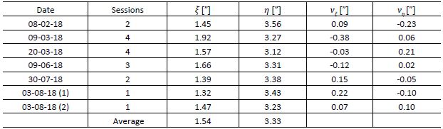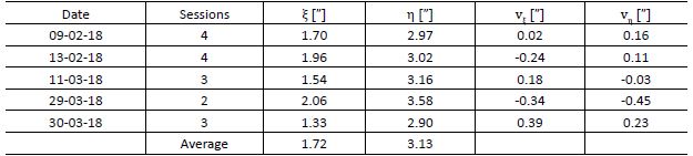 Five nights of preliminary astrogeodetic test observations were conducted with the ACSYS2 at the ITU test station to determine the precision of the instrument. The observed VDs were obtained through 2-4 observation sessions, resulting in 80-160 time- and tilt-tagged images (10 images are obtained at each of the four azimuths) at 0.3 seconds exposure time each night. The mean of each night’s VDs data and the difference between the mean values and the average values can be seen in Table 2. Overall, the differences between the mean and average values are satisfactory for both the North-South and East-West components. The average SD across the 5 nights of measurements (for nightly mean values) is 0.30” for the North-South (ξ) and 0.27” for the East-West (η) components.
