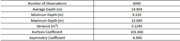 From the variance (Table 1), it can be concluded that the data show low variability (WARRICK & NIELSEN, 1980). Moreover, coefficients of asymmetry and kurtosis, which quantify the deviation of depth distribution with respect to a symmetrical distribution and flatness degree of distribution, respectively, indicate an asymmetrical distribution to the left (negative), leptokurtic and, a priori, with a large concentration of values around the mean. To sum up, the distribution is non-normal and/or is affected by abnormal values.