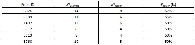 Finally, the Modified Z-Score threshold underestimated spike detection. Twenty-four spikes were found, out of which 16 are anomalous depths, i.e., an agreement of 66.67% and a success percentage of 42.15%. Overall, this threshold was more efficient than the Adjusted Boxplot. Analyzing the undetected spikes, in accordance with what previously happened, the Modified Z-Score showed the same problem: agglomerate spikes in the extremities of the study area and in holiday areas were not detected. Conversely, eight valid depths were mistakenly flagged as spikes, where six out of these eight were also detected by the Adjusted Boxplot and the other two - ID 6377 and ID 7801 - showed about 20 centimeters difference with respect to their neighborhood.