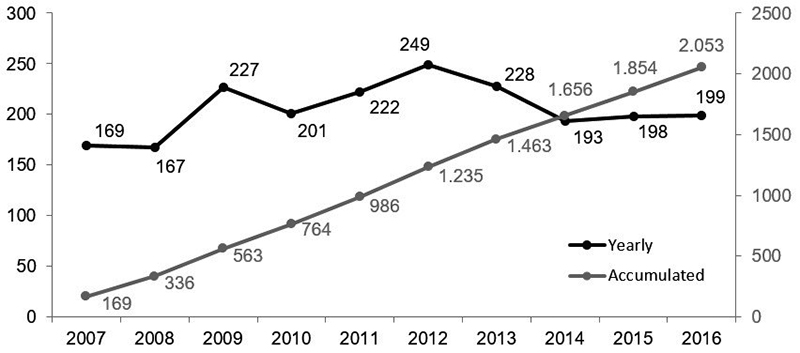 From 2007 to 2016, the annual growth rate of the publication in selected journals was 1.8%. This value corroborates the percentage of increase found by Tian, Wen and Hong (2008), although their sample was much larger and included the periods 1997-2006 (9,109 papers from 1,918 journals).