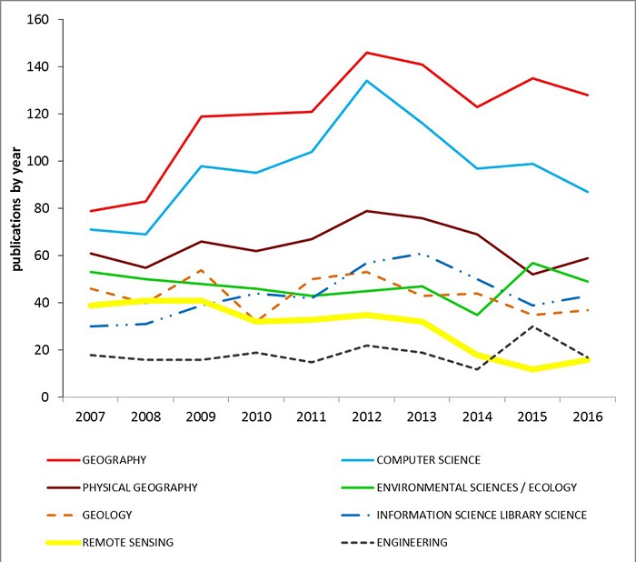 The bibliometric mapping of scientific papers published from 2007 to 2016 in the top 20 GIS journals extracted from the Web of Science Core Collection, allowed evaluating the characteristics and recent trends of these publications.