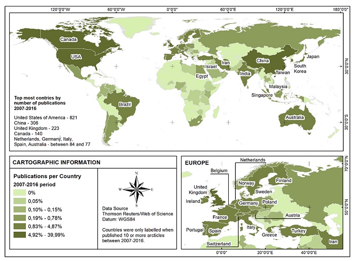 The world map shown in Figure 3 is very similar to that developed by Liu et al. (2016) and highlights three main clusters: North America, Western Europe, and Eastern Asia. From this perspective, it is considered that the supremacy in the publication of papers remained unchanged.