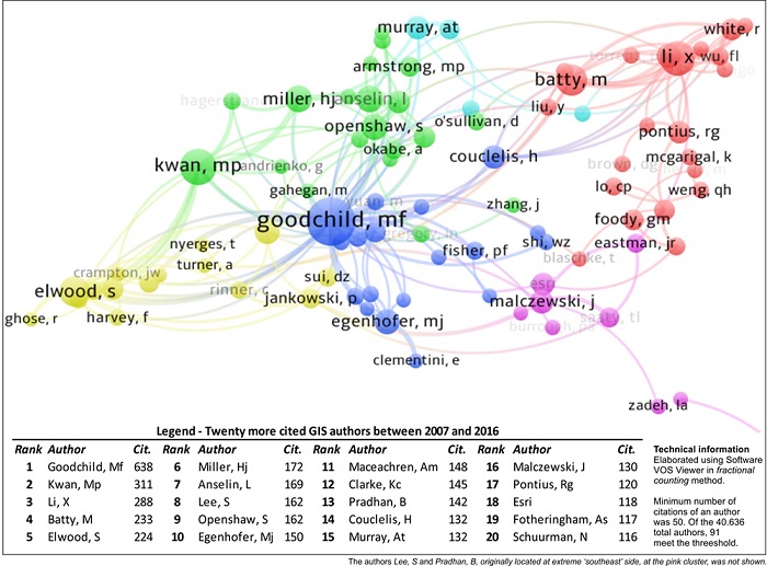 In this figure, the authors are represented by proportional circles and indicate their relevance in comparison to the represented universe. The greater the lines thickness, the stronger the connection between the authors, while the colors selectively show the groupings by connection levels. Goodchild appears with the greatest symbol, being the most cited author among the selected journals on GIS between 2007-2016 (638 citations). The proximity indicates the degree of similarity between the key words of the authors' papers and, the colors, group that affinity.