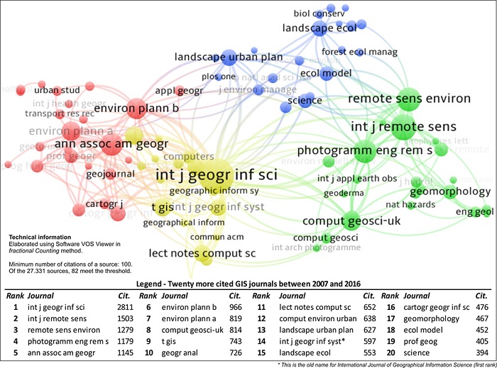 Among the obtained results, this classification differed the most from the classification of Liu et al. (2016). Among the 20 journals, although the first four were the same, only six were common to the two classifications: International Journal of Geographic Information Science, International Journal of Remote Sensing, Photogrammetric Engineering & Remote Sensing, Computers, and Geosciences, Environment and Planning B., and Landscape Ecology.