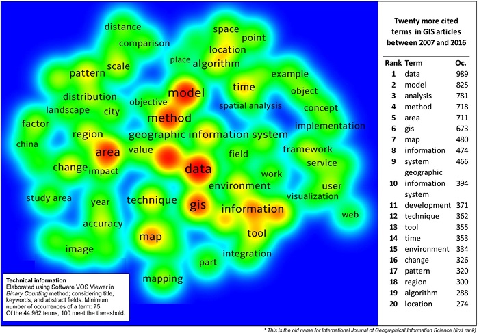 Figure 6 was constructed using an interpolation Kernel function and shows the most cited words in the abstract, title, and keywords of the retrieved papers. In this representation, word co-occurrence was used. It is a technique of content analysis that uses the words of documents to establish relationships and build a conceptual framework of the domain (Callon, Courtial, Turner, and Bauin 1983). In addition to the term “GIS” used in sample selection, other common terms were used, such as “data,” “model,” “analysis,” “method,” “area,” and “map.”