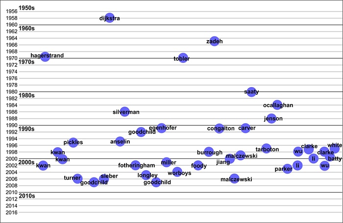 The analysis of the oldest citations allowed the identification of the most relevant papers, including “A note on two problems in connection with graphs” (1959) by E. W. Dijkstra, “Fuzzy sets” (1965) by L. A. Zadeh (1965), “Innovation Diffusion as a Spatial Process” (1967) by T. Hägerstrand, and “A Computer Movie Simulating Urban Growth in the Detroit Region” (1970) by W. Tobler, and the latter author established the First Law of Geography (Tobler's Law).