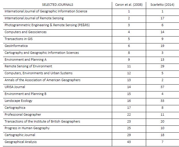 The papers and their metadata were extracted from the Web Science Core Collection platform (WoS). The selection of the international journals was based on the studies by Scarletto (2014) and Caron, Roche, Goyer and Jaton (2008), who classified the main journals on GIS. Twenty journals common to both studies were selected. Table 1 represents the selected journals and also the position of the search rankings of these authors. In these 20 journals, the terms “Geographic* Information System*,” “GIS,” and “GIScience” were searched in the title, abstract, or keywords of WoS database. The analyzed sample totaled 2,053 scientific papers.