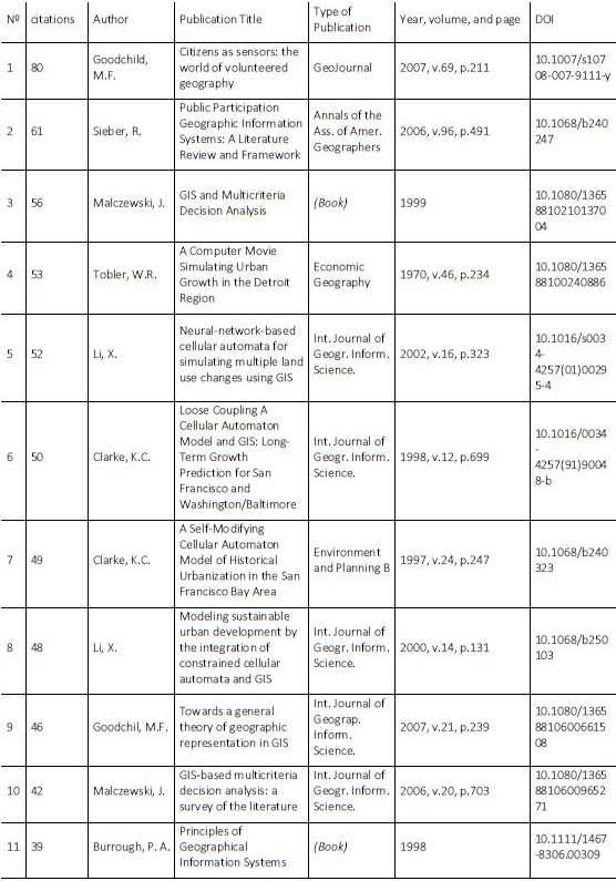 The Journal Geographic Information Science was considered the most important in the evaluated period, maintaining the leadership with the studies by Tian, Wen and Hong (2008) and Liu et al. (2016). The most cited words were “data,” “model,” “analysis,” “method,” “area,” and “map.” The most cited paper was “Geographical Information Science” (1992) by M. Goodchild (80 citations), who was also the most cited author of our sample (638 citations). The most relevant topics were cellular automata, relationship between GIS and users, integration between GIS and remote sensing, different land-use classification methods, and critical reflections on technologies and GIS.