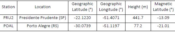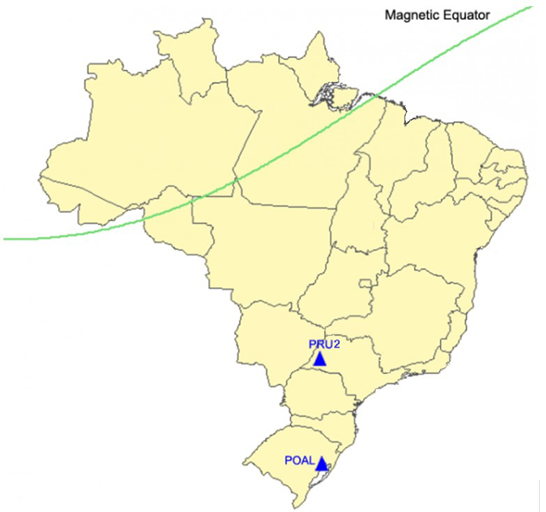For the experiment, two stations (PRU2 and POAL) from CIGALA/CALIBRA (Concept for Ionospheric-Scintillation Mitigation for Professional GNSS in Latin America/ Countering GNSS high Accuracy applications Limitations due to Ionospheric disturbances in BRAzil), located at different magnetic latitudes (and consequently affected by variable ionospheric activity) were selected (Table 1, Figure 1). PRU2 station is positioned at a magnetic latitude of around -13°, being therefore located in the south crest region of the equatorial anomaly, where the TEC density is very high and variable, and where plasma bubbles can frequently appear, leading to the generation of irregularities such as the scintillation. POAL station, on the other hand, is located at a magnetic latitude of around -21°, region characterized by weaker and more regular TEC activity. The selection of these two stations captures the ionospheric activity extremes in the Brazilian region.