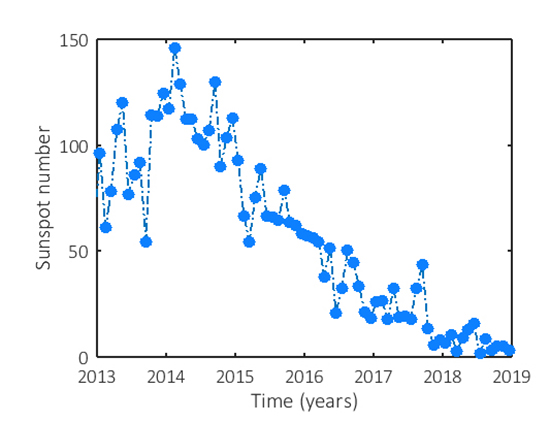 To analyze the performance of both models under the effects of different ionospheric conditions, it was selected three days of June and three days of October from 2013 (year that Galileo started broadcasting the NeQuick G parameters) to 2018 (from the 20th to the 22nd of June and October, except for October 2018, when the selected days were the 30th and the 31st due to data availability). The selected days of June were close to the Winter Solstice in the Southern Hemisphere, characterized by weak ionospheric activity, and the days of October were close to the Spring Equinox in the Southern Hemisphere, characterized by strong ionospheric activity. The selected period from 2013 to 2018 covers part of the solar cycle 24 (and its possible transition to solar cycle 25), which reached its peak in 2014 and is getting weaker since then (Figure 2).
