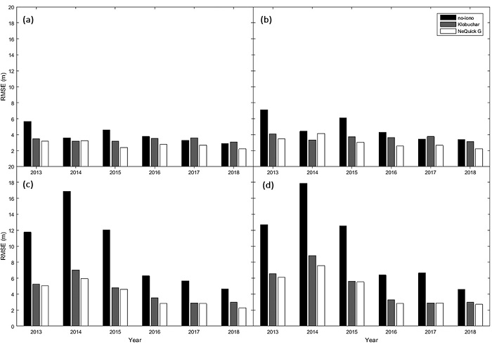 The performance comparison between the two models have been conducted at the position domain. To evaluate the efficacy of the ionospheric models, the estimated position without ionospheric correction (called “no-iono”) is also analyzed. The analysis is presented mainly in terms of the tridimensional position root mean square error (RMSE), using as reference the stations known coordinates.