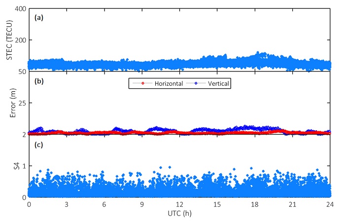 Figures 4 and 5 (c) present the S4 index for the two analyzed days. The S4 is an index computed from the satellite signal power or signal intensity (Van Dierendonck 2001), and is used to characterize the ionospheric scintillations, rapid variations in the amplitude and phase of the GNSS signal caused by small scale irregularities in the ionosphere, degrading the position estimate. Ionospheric scintillation severity is usually classified as strong when the S4 index is higher than 1 (Tiwari et al., 2011). As can be noted in Figure 4 (c) and is documented in literature (Kelley, 1989; Marques et al., 2018), scintillations generally occur in periods of active ionosphere starting after local sunset, approximately 18h local time, affecting the GNSS signals until around 3h local time in the morning. By comparing Figure 4 (b) and (c), it is clearly noticeable that the error peaks occur simultaneously to periods of strong ionospheric scintillation.