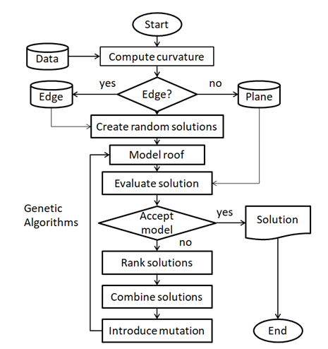 Compared to other existing methods, the use of GAs presented some advantages: supplementary information (such as maps, structure libraries or plane detection) was not required; only an effective edge detection algorithm was needed. And because it did not require a predefinition of the roof’s shape, it could be used to model irregular geometries and with any number of sloping sides. Also, dividing the GA’s initial process in three stages (using different cloud densities) was proven to reduce processing time.