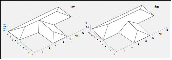 Figure 5 shows a representation of the simulated roofs, highlighting their significant points. They were named as follows: (a) roof 1 - gable roof, 2 sloping planes; (b) roof 2 - hip roof, 4 sloping planes; (c) roof 3 - intersecting hip roof, 8 sloping planes.
