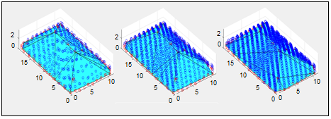 Roof house 1 is similar to the simulated hip roof. It is a simple roof, with 4 sloping sides, but its line distribution is not uniform, probably because it was the result of two or more scans. Figure 11 shows the original point cloud from Roof house 1’s test. It is known that the spacing between points and lines are approximately 46 cm and 1 m, respectively. Figure 12 shows the evolution of the iterative process during its three stages.