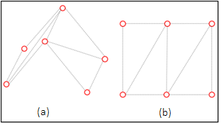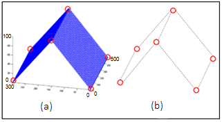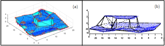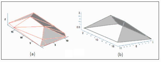 As a larger quantity of points was proposed for the model, redundant triangles were produced. They were eliminated in the last step by analyzing the angle between adjacent triangles: small vertices and its composing edges (< 45o) were removed from the model. For example, Figure 14a shows the solution of this first experiment, and Figure 14b shows the same solution after this criterion was applied.