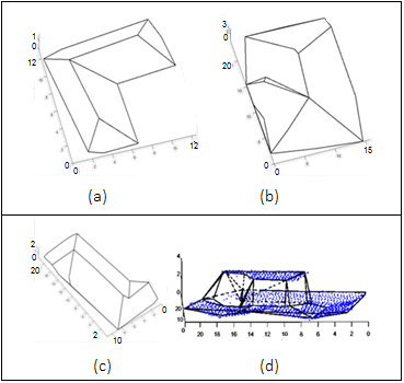 Figure 15 presents the original LIDAR point clouds of the other four roofs. Figures 15a and 15c show Roof house 2 and Roof house 4, which are L-shaped and Z-shaped, respectively. Roof house 3, shown in Figure 15b, is rectangular, with four sloping sides and two protuberances on the largest surfaces, which makes modeling more difficult. Figure 15d, which shows Roof house 5, is the top of a building (probably a roof terrace), with a big flat roof and an elevation, also flat, where the water tank is. This last example was included to verify whether the developed method was capable of detecting flat roofs. It is known that the spacing between points and lined is of approximately 45 cm and 1 m, respectively.
