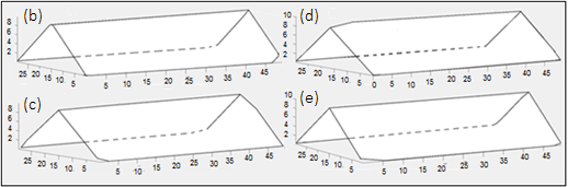 The same procedure was repeated, but introducing noise to the dataset, with different maximum noise values (10, 15, 20 e 25 cm, which were named Tests b to e). Deviations higher than 25 cm were considered unnecessary because the distance accuracy of airborne LIDAR is around 15 cm (Baltsavias, 1999). Table 2 summarizes the numerical results for Tests b to e, and Figure 8 shows the obtained models.