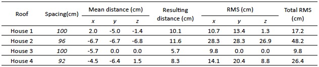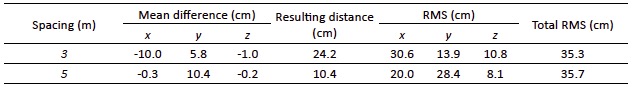 As for scan line spacing, the roof’s geometry was correctly identified using both 3 m and 5 m. Errors were small and within the expected values. Theoretically, the best results are usually obtained when using a higher density point cloud. However, during this experiment, a variation of only 2 m (from 3 to 5 m) was not sufficient to cause significant alterations neither in distance between coordinates nor in RMS values. The fact that this variation did not truly affect the results also suggests that the proposed method is capable of processing data with different densities.