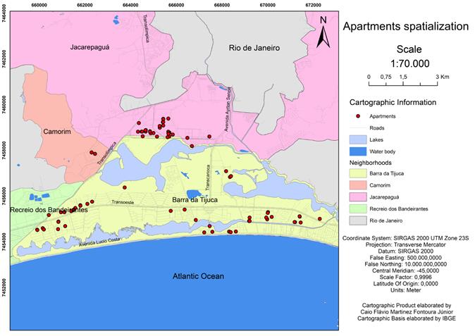 Figure 4 illustrates the specialized properties by urban areas of a part of the West Zone of Rio de Janeiro, with the samples being concentrated in greater quantities in the neighborhoods of Barra da Tijuca and Jacarepaguá. And some properties located in isolated areas, two properties in the Camorim neighborhood and one property in Recreio.