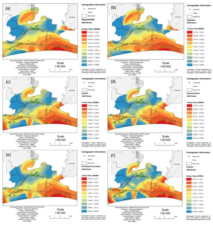 Through the values foreseen in the geographically weighted regression model, using the unit values of each property according to each geographical location, the surface of values was determined, which uses the software ArcGIS 10.3 (ESRI, 2014). Table 5 shows the results of the cross-validation of the Exponential, Gaussian, Epanechnikov, Quarctic, 5th order Polynomial functions and the Constant, in which it can be concluded that the Gaussian function obtained the best results in the Cross-validation.