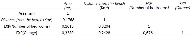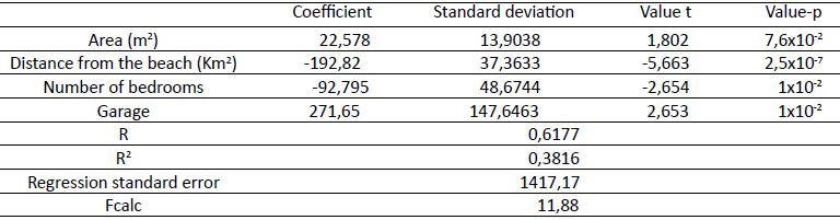The description of the independent variables used, and their respective transformations are Area, without transformation; distance from the beach, without transformation; Number of rooms, the exponential transformation was applied, and Number of Garages were also applied to exponential transformation. Table 1 shows the calculated t and its significance for each regressor. The tabular t was considered two-tailed with a significance level of 10% and n-k-1 degree of freedom (77) equal to 1.6649. All regressors have significance, as the t table in the module is less than the t calculated.
