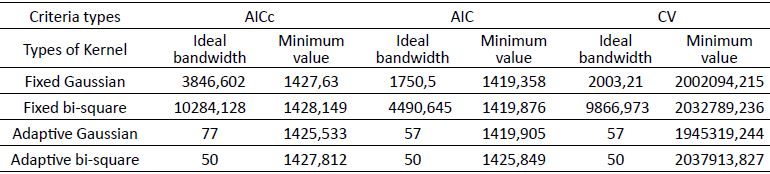 For Almeida (2012), when the bandwidth is not known, it can be acquired by the technique of the cross-validation optimizer (CV). Another way to determine the best bandwidth is by using the lower values of the AIC, which indicates the most suitable bandwidth for determining the data model. The AIC can be used in different areas, one of the main areas applied is statistics, used mainly in classical regression and geostatistics (Emiliano, 2009).