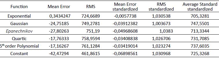 With the values estimated by the GWR the spatial distribution of the data, began the creation of the surface of values, through Geostatistics, through the Kernel estimator. The Kernel estimator is an interpolator, which can estimate the intensity of the eventuality across the region, even in locations where the process has not created any real occurrences (Santos, Santos and Santo, 2012). Through the analysis of Geostatistics, six surfaces were generated using the kernel functions, among them: Exponential, Gaussian, Quartic, Epanechinikov, Polynomial and Constant. Thus, the analysis was carried out by cross-validation the previously mentioned kernel functions.