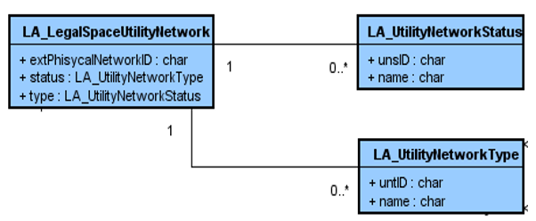 Associated with this class, the LA_LegalSpaceUtilityNetwork class is also presented along with its specifications: LA_UtilityNetworkStatus and LA_UtilityNetworkType.