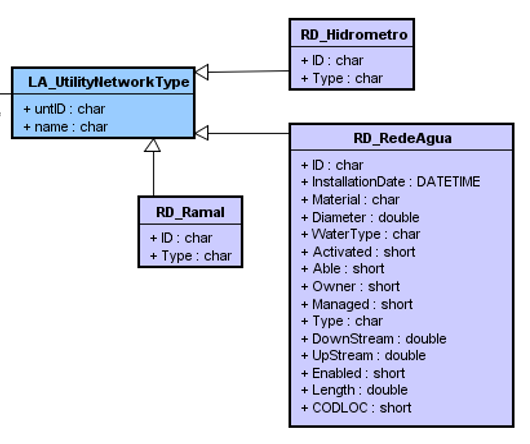 The classes that specifically characterize the water distribution network within the database of the study case used in this research were associated to the class LA_UtilityNetworkType, because they configure a type of network taken as an example: the water distribution network to the user.