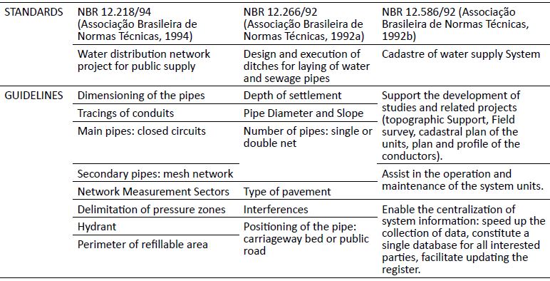 Brazilian standards that establish the guidelines for the elaboration and implementation of supply systems and water distribution networks, determine what is necessary for the process of elaborating water supply projects from conception to final destination. Among the various existing standards the ones which relate directly to the modeling proposed in this research are highlighted in Table 1.