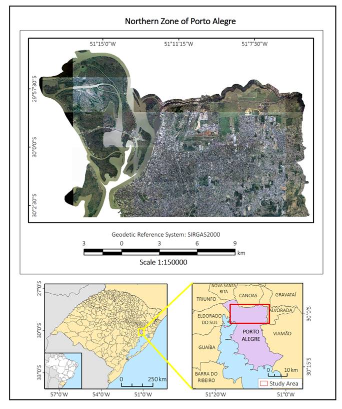 The study area of this paper (Figure 1) comprises the northern zone of Porto Alegre, capital of the state of Rio Grande do Sul, and is limited by latitudes 29˚58’S and 30˚02’S and longitudes 51˚05’W and 51 ˚15’W. This region covers an extension of 127.57 km², which represents 27.04% of the area of the municipality. According to the 2010 census, there are 146,211 households and a population of 411,847 inhabitants in the region, which corresponds to 29.22% of the population of the municipality (ObservaPoa, 2016).
