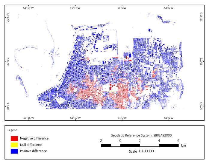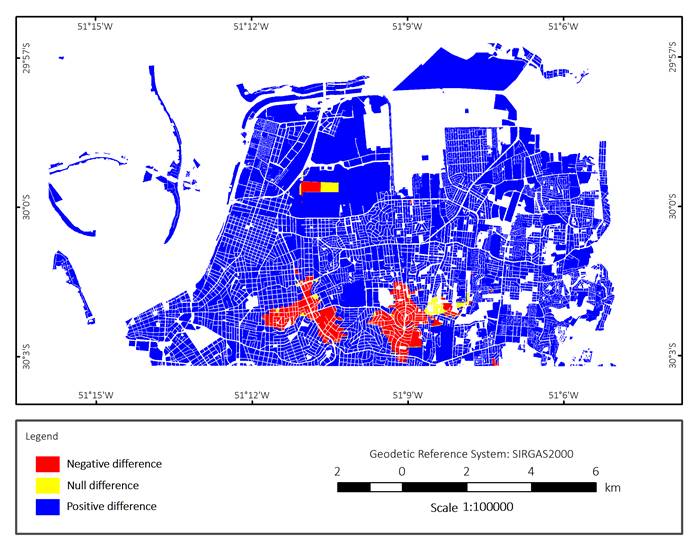 The same procedure was performed with buildings, with PBZPA being the identifier file and buildings being the file to be identified. The comparison between the heights, in turn, was made by subtracting the heights of the limiting surfaces by the maximum heights of the buildings.