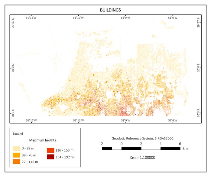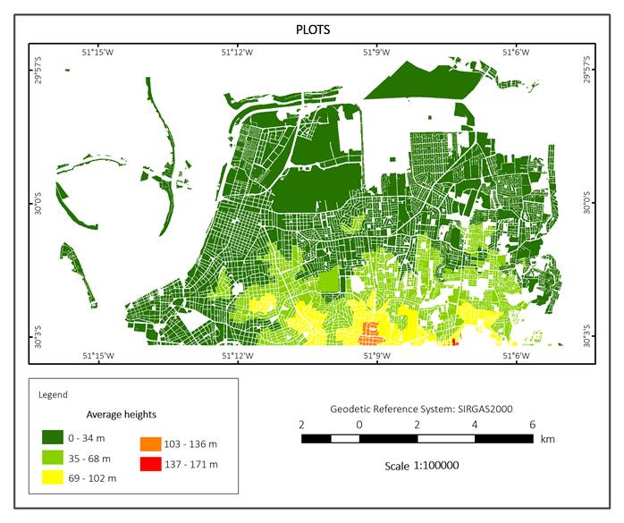 Figure 4 represents the study area plots classified according to their average heights. It is noticed that the plots with the highest average heights are concentrated in the southern portion of the study area, extending to the eastern portion of it. And, around the Salgado Filho International Airport, northwest, north and northeast portions are the plots with the lowest average heights.