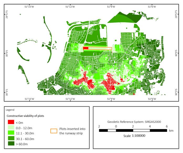 The map in Figure 7 shows the constructive viability of the plots. The classes indicate the maximum height of the buildings that can be built in each plot. Considering the accuracy of 0.5m for the height of the plots the constructive viability was divided into 5 classes. The approximate number of floors was estimated based on the legislation and the master plan of the municipality. In class < 0m no buildings are allowed, as the terrain already exceeds the limiting surfaces of the PBZPA. Classes from 0.0 to 12.0m show plots with constructive viability of up to 4 floors, from 12.1 to 30.0m are plots with constructive viability of 5 to 10 floors, from 30.1 to 60.0m are plots with constructive viability of 10 to 20 floors, and > 60.0m are plots with constructive viability above 20 floors.