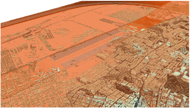 By comparing the 3D models of buildings and the PBZPA it was possible to identify and quantify the obstacles related to buildings. Figure 8 shows the 3D representation of buildings projecting, wholly or partially, into airspace. And Figure 9 shows, in detail, an area near the airport where you can view buildings that exceed limiting surfaces of PBZPA.