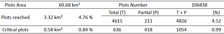 For the quantification of affected plots and critical plots, 106838 plots were considered, representing an area of 69.68 km². Table 1 presents the area of the plots reached in percentage and km², the number of plots reached, totally and partially, and the number of plots that are in the limit of the protection zone (critical plots), considering the accuracy of 0.5m.