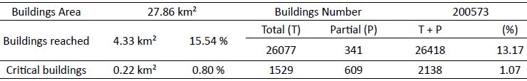 The quantification of the affected buildings and critical buildings was performed considering 200573 buildings, which represent a built area of 27.86 km2. Table 2 shows the area of buildings reached in percentage and km², the number of buildings reached, totally and partially, and the number of buildings that are in the limit of the protection zone (critical buildings), considering the accuracy of 0.5m.