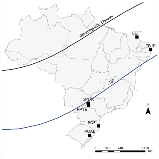 In this paper, we used data of six GNSS stations from RBMC (Brazilian Network for Continuous Monitoring). The stations were selected in order to represent three Brazilian regions with different ionospheric behavior. Stations CEFT and PBJP, representing a region nearest the Geomagnetic Equator, SPDR and PPTE, representing a region affected by the fountain effect, and stations SCFL and POAL, representing a region with lower ionospheric activity. Figure 1 presents the locations of the RBMC stations selected.