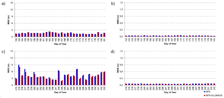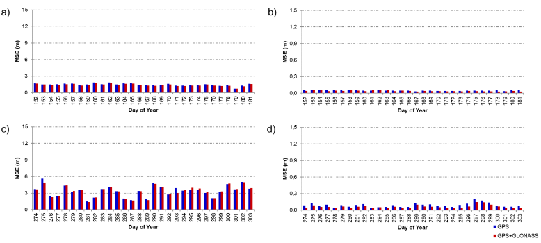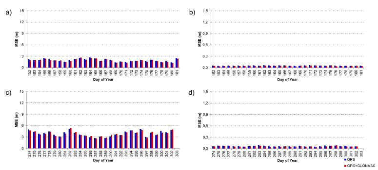 The positioning results were compared with the official station coordinates (provided by the Brazilian Institute of Geography and Statistics), transformed to the same reference frame and updated to the epoch of the campaign. Using these discrepancies and the standard deviation from the processing, the mean squared errors (MSE) were obtained.