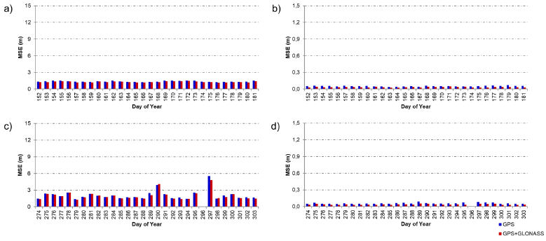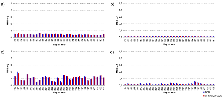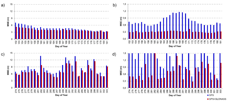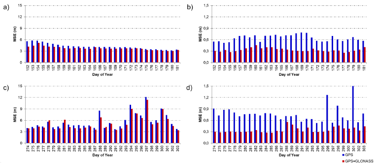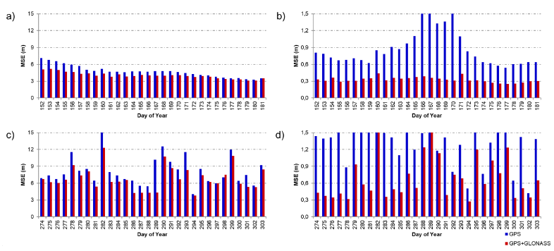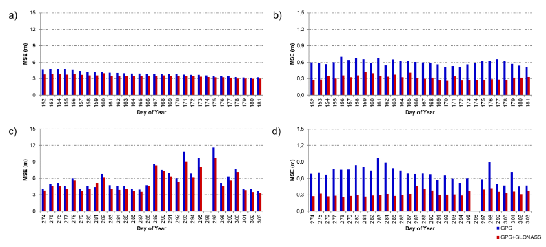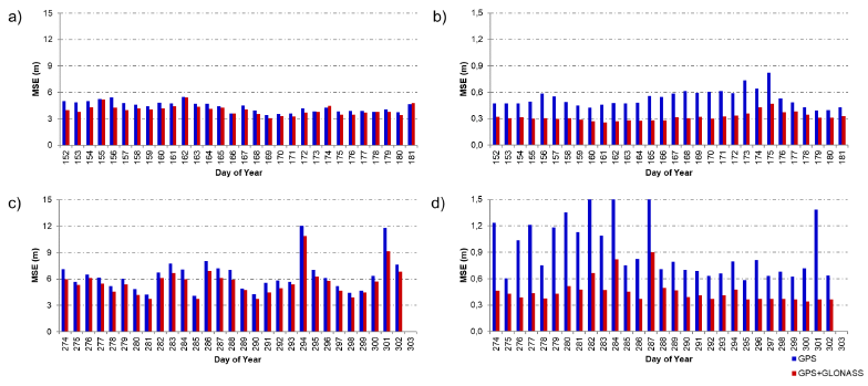Table 2 presents MSE mean values and percentage of improvement obtained by using GPS/GLONASS considering all configurations for each station. It is possible to verify that the stations in the same regions presented an order of magnitude of the mean values and percentages of improvement similar, mainly the stations in the regions of fountain effect and with lower ionospheric activity. The PBJP station presented results closer to those from the fountain effect region, as previously mentioned, PBJP station is closer to -15° latitude than the CEFT station (closer to the Geomagnetic Equator) (as showed in Figure 1), which could explain the behavior of the results compared to those obtained with data from stations located in similar latitudes. Taking into account all configurations of all the stations, the use of GPS/GLONASS data provided better results in 97.35% of the cases, the mean improvement was about 60 cm, which corresponds to 30%. It is worthwhile to highlight that the improvement in the results of L1 data was higher than those of L1/L2 data, considering absolute values. Single frequency data presented a mean improvement of 75 cm by adding GLONASS data to GPS, against 45 cm when dual-frequency data are considered. As previously mentioned, single frequency data present higher error, thus higher improvement rates by using combined data were expected.
