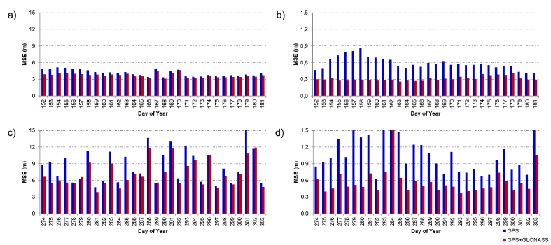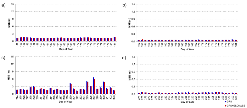 It is also possible to identify more irregular behavior in results with October data (Graphs c and d), as mentioned before, a period characterized by more intense ionospheric activity. That difference is even bigger in the PBJP station, located nearest -15° latitude (region affected by the fountain effect) than CEFT (Figure 1). Concerning the GPS/GLONASS data, CEFT station presented better results in almost all days considered (96,6%) when combined data were used. Only four days using L1 data from June (Graph a) presented smaller MSE with just GPS data. PBJP presented similar behavior with just one configuration with better results in four days using GPS-only data, it was also with L1 data, but in this case with data from October (Graph c).
