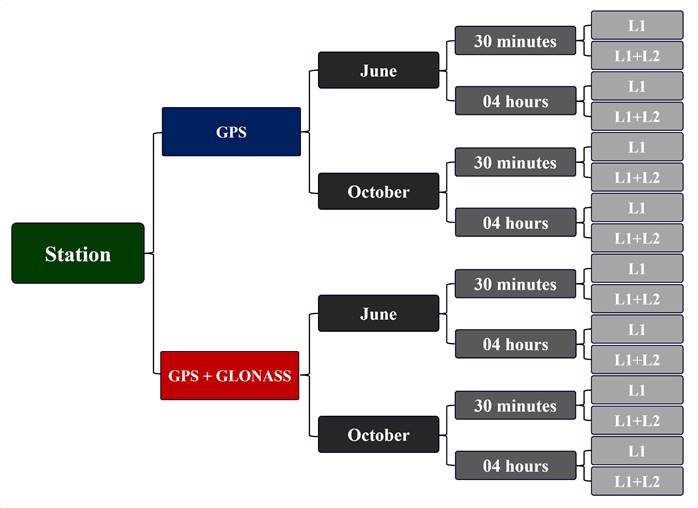 Data from RBMC stations were applied to point positioning processing (static mode) using the online software CSRS-PPP (Canadian Spatial Reference System - Precise Point Positioning) developed by NRCan (Natural Resources Canada). The periods considered were June (low ionospheric influence) and October (high ionospheric activity). These characteristics are due to the seasonal condition and zenithal angle of the Sun related to the region of the stations used in this study. The selection of the year (2014) was intended to take into consideration the last eleven-year solar cycle (cycle 24), with peak between 2013 and 2014. Files with 30-minute and 04-hour of data collection, starting at 00h UT - Universal Time (21h Local Time) were used. The selection of the collection starting time aimed to consider the influence of ionospheric scintillation. We used files with single and dual-frequency data, collected using 10° elevation mask, 15 seconds sample rate, with GPS or GPS/GLONASS data. Figure 2 presents the processing configurations used for each station, considering that for each position were processed observations files with GPS and GPS/GLONASS data, from June and October, considering 30 minutes and 04 hours of data collection and single and dual-frequency data. In the software used for data processing, Davis and Hopfield models are used for the estimation of hydrostatic and wet components of the neutral atmosphere, respectively. L1 data processing is performed using pseudorange and IONEX files for ionospheric modeling. L1/L2 data processing uses phase and pseudorange and a linear combination (ion-free) to mitigate the ionospheric effect.