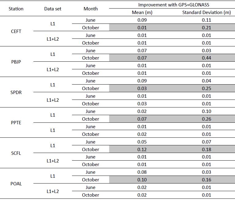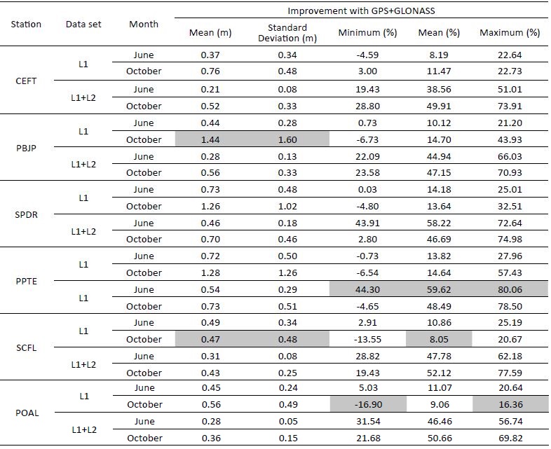 In order to summarize all information presented so far, Table 1 shows the MSE mean and standard deviations and percentages (minimum, mean and maximum values) of improvements obtained by using GPS/GLONASS data for each station. Only two configurations presented standard deviation higher than the mean value: stations PBJP and SCFL, both using L1 data from October (highlighted in grey). It was also noticed that the bigger improvements are observed in the period with higher ionospheric activity (October), the only exception are the values presented by SCFL station with L1 data, located in the region with lower ionospheric activity.